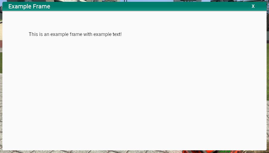 local frame = MatLib.Frame(-1, -1, ScrW() * 0.5, ScrH() * 0.5, "Example Frame")