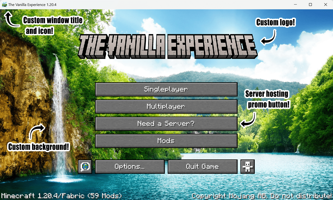 Simple Menu provides an alternative to other extensive main menu editors. I needed more basic functionality that was quickly released after each Minecraft update for my The Vanilla Experience modpack. It's however highly configurable and might be what you need as well. Intentionally kept simple. If you'd like more control, I recommend using FancyMenu.