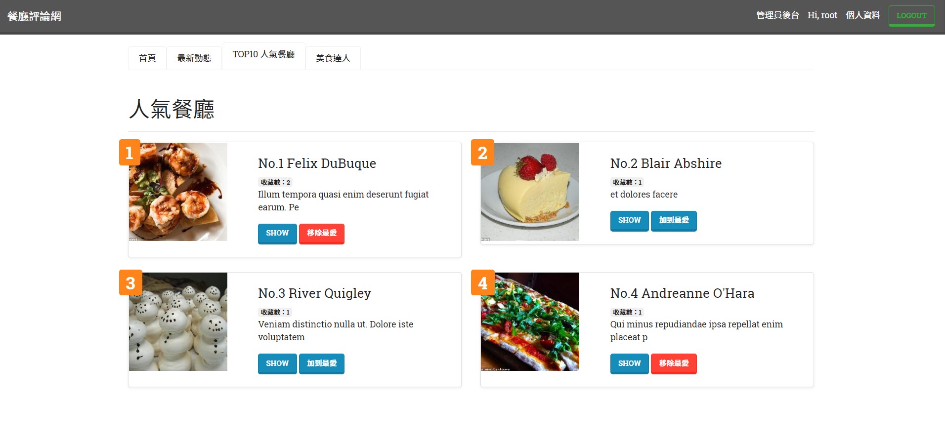 一個使用 Node.js/Express + MySQL/PostgreSQL 打造的美食餐廳評論網站,有眾多網友的分析與評論,以及人氣餐廳的排行,輕鬆找到心目中適宜的店家。