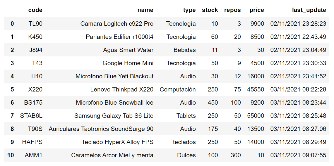 Esta función sirve para imprimir la matriz de registros donde se podra visualizar los ajustes realizados dentro de la base de datos. Al igual que en la función para imprimir los productos, la matriz es impresa y guardada como un dataframe de pandas.