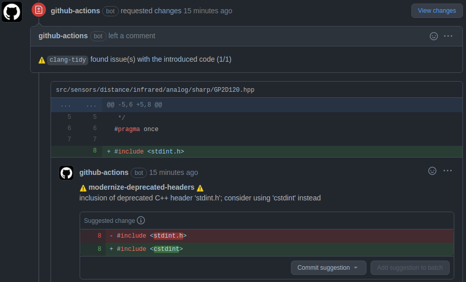 A GitHub Action to post clang-tidy warnings and suggestions as review comments on your pull request.