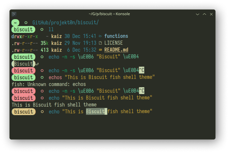 fisher install projekt0n/biscuitTo display the current Git branch in the command prompt, set the biscuit_show_branch_name variable in the config.fish file located in the $__fish_config_dir directory.